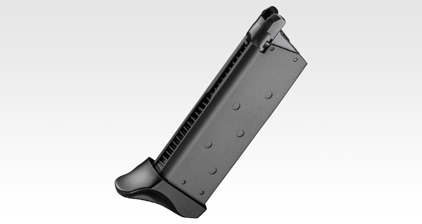 装弾数18発、薄型ながら冷えに強いダイカスト製のマガジンが付属。フィンガーレスト付きのマガジンバンパーによって、グリップ時の安定感を確保しています。