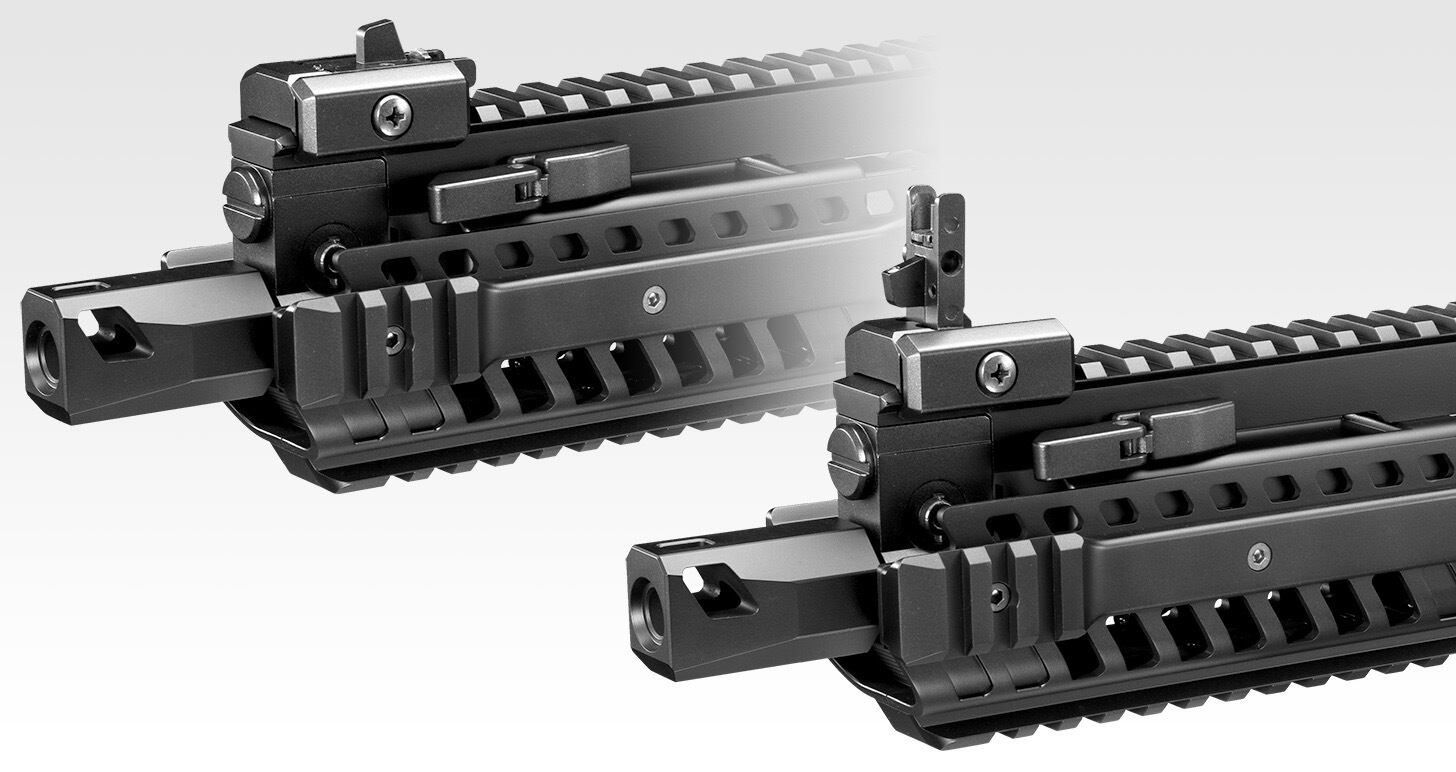 脱着式KSKサイトを再現。フロントサイトで上下に、リアサイトで左右に着弾点を細かく調整することができ、サイトを倒して使用することも可能です。