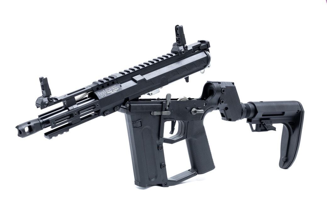 C.A.T.では一般的な電動AR15レシーバーの寸法でリアルなテイクダウン機構を再現するために、ピストンストロークのショート化を行いアッパーメカボックス後端を短縮しました。