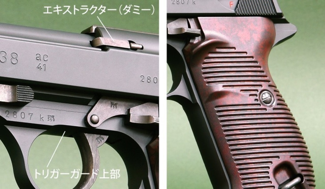 ★トリガーガード上部は、ac41の特徴であるストレートラインを忠実に再現。★エキストラクターはダミーながら金属製の別パーツを使用。★P38戦時モデル独特の横溝グリップの形状は、実物図面を基に立体化。塗装職人による高度なエアブラシ技術で1つ1つを丹念にペイントし、当時ベークライトで作らていた特徴のある赤茶マーブル模様を再現しました。