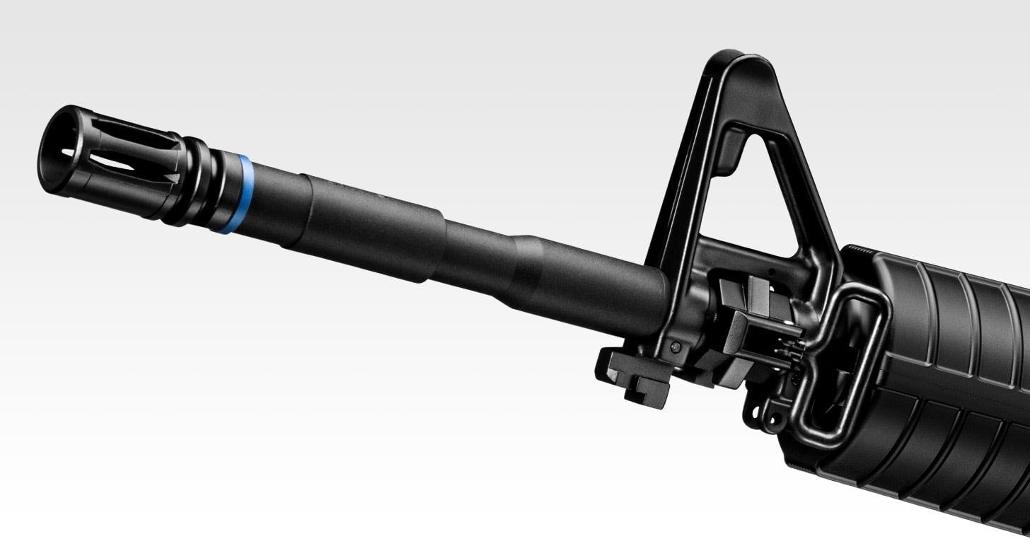 14才以上推奨モデルと一目でわかる、ブルーのマズルリングを装備。※コンペンセイターは取り外しできません。
